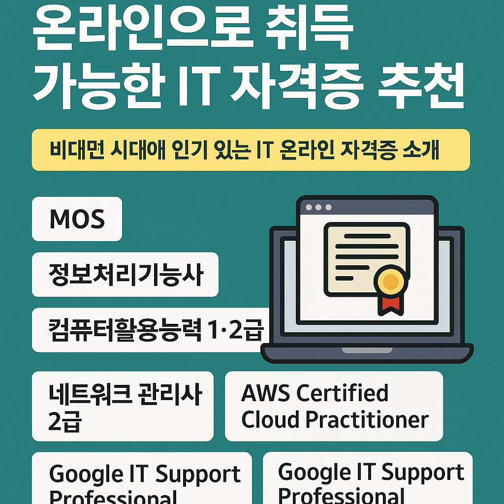 온라인으로 취득 가능한 IT 자격증은 다양하며, 단순 사무직부터 개발·보안·클라우드까지 영역을 넓힐 수 있습니다. 시간과 장소에 구애받지 않고 나만의 페이스로 준비할 수 있다는 것이 큰 장점이죠.